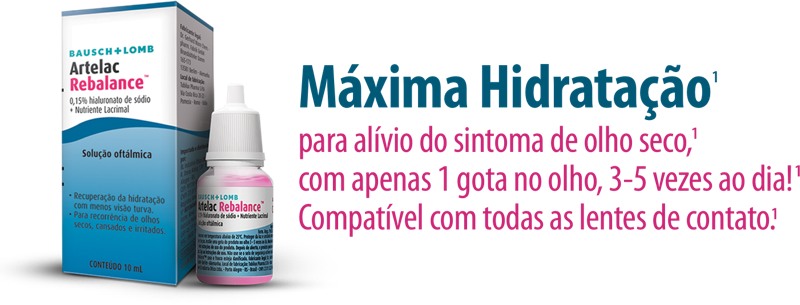 ARTELAC REBALANCE™ – solução estéril – embalagem contendo 10 mL – Uso Tópico Oftálmico. INDICAÇÃO: Indicado para aliviar e atenuar os sintomas de olho seco resultantes da deficiência crônica de lágrimas. A deficiência lacrimal crônica pode ser causada por uma série de fatores, incluindo disfunção e inflamação da glândula lacrimal, deficiências sensoriais na pálpebra e/ou má qualidade das lágrimas. CONTRAINDICAÇÃO: Não use o produto em caso de hipersensibilidade a um dos ingredientes. CUIDADOS DE CONSERVAÇÃO: Depois de aberto, o produto pode ser usado por 02 meses. Conservar em temperatura abaixo de 25°C. Proteger da luz e umidade. MODO DE USO: O tratamento da síndrome do olho seco requer disciplina pessoal de acordo com a gravidade e a intensidade dos sintomas. Instile uma gota Artelac Rebalance™ no olho 3-5 vezes ao dia. ©Bausch & Lomb Incorporated. Artelac Rebalance é uma marca da Bausch & Lomb Incorporated ou de suas afiliadas – Registro na ANVISA nº 80136060285. Março/2021. Material dirigido exclusivamente para médicos.